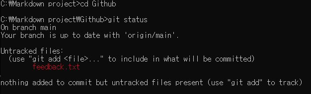 git status 명령을 통해 feedback.txt파일이 staging area 에 놓여있지 않은것을 확인 할 수 있다.