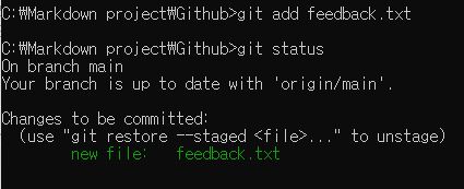 git add 명령을 실행 한 뒤 다시 git status 명령을 하여 파일의 상태를 확인하면 feedback.txt파일이 staging area에 놓여진 것을 확인 할 수 있다.