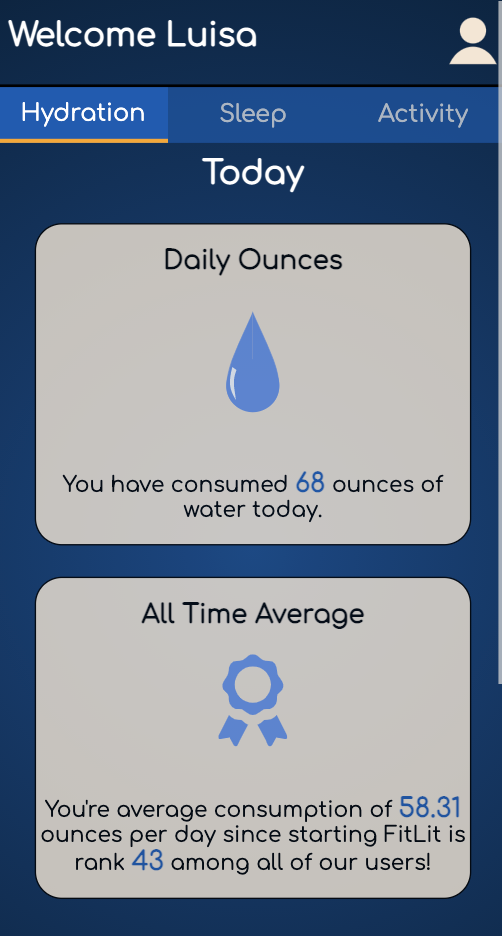 FitLit is a sample fitness application providing mock user data to a mock user at a glance. This was the partner project for our time during Mod 2 at the Turing School of Software and Design. The purpose of this application is to provide a sample fitness style dashboard that utilizes classes and methods to calculate and display data and external libraries to display the data on the DOM.
