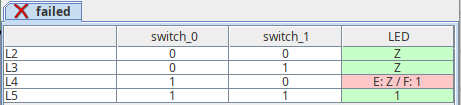 In L4, the "E: Z / F: 1" means that when the circuit is given the inputs in L4, the expected output is Z, but the actual output is 1. For this circuit or more complicated circuits in the future, if you fail a test case, you could click it (here, L4) to see what happens in the circuit that causes the test failure.