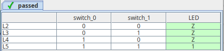 In this table, the switch_0 and switch_1 columns are inputs, and LED is the output that is checked. Each row represents a single test case. For each test case, we provide hardcoded inputs and the expected output. Digital then simulates the circuit with the given inputs and checks whether the output is correct or not. If you click on L2 or any other row, you'll see how this works.
