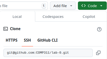 As we did in COMP 211, we will clone GitHub repositories via SSH. If you have already generated an SSH key on your computer (not inside the COMP 211 container) and connected it to your GitHub account, skip to Clone repo.