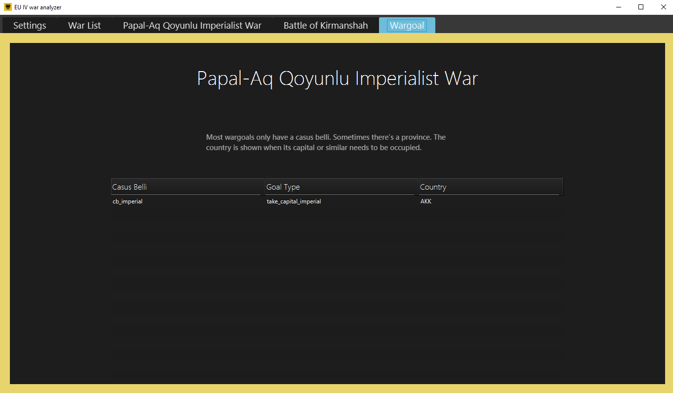 The analyzer reads the save game produced by EU4 (it's a strategy game, look it up) and presents all the wars in a family-friendly way. The program retrieves all the data that can be retrieved from the save file, such as total losses in a war, all the battles, wargoals and the war participants.