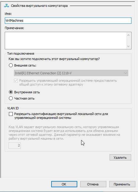 - А дальше создать виртуальный сетевой коммутатор, выбрав для него режим внутренняя сеть
