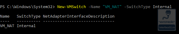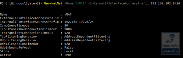где Name - имя нашей сети NAT, в нашем случае vNAT, задается на ваше усмотрение, InternalIPInterfaceAddressPrefix - внутренняя сеть NAT.