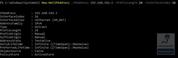 New-NetIPAddress -IPAddress 192.168.192.1 -PrefixLength 24 -InterfaceIndex 16
