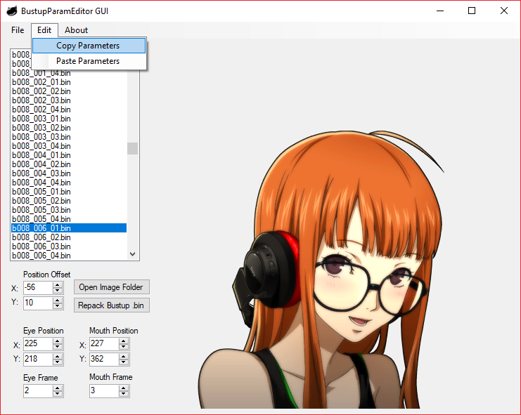 you can change the values for X and Y positioning of the mouth, eyes, or the entire bustup itself.