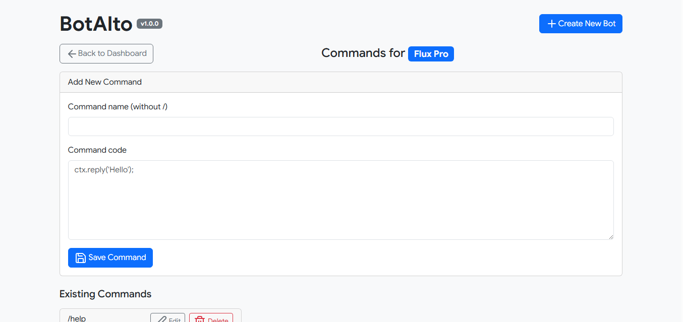 - β¨οΈ Custom Commands: Create and edit bot commands with JavaScript code