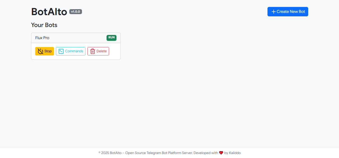 | β v1.0.0 | LIVE | Core bot creator, hot-reload commands, start/stop per bot, zero-config |
