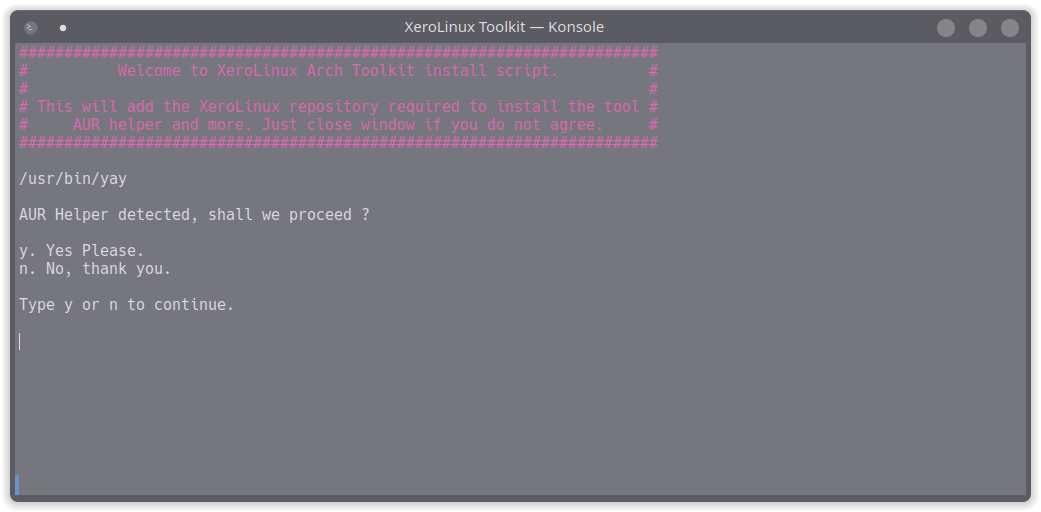 It's just a simple Terminal curl command that you run which will prompt you before injecting as in adding the XeroLinux repository, where from it will then prompt you, should you agree, as to which AUR helper you prefer, then proceed to do so then install and launch the toolkit.. Again only if you agree..