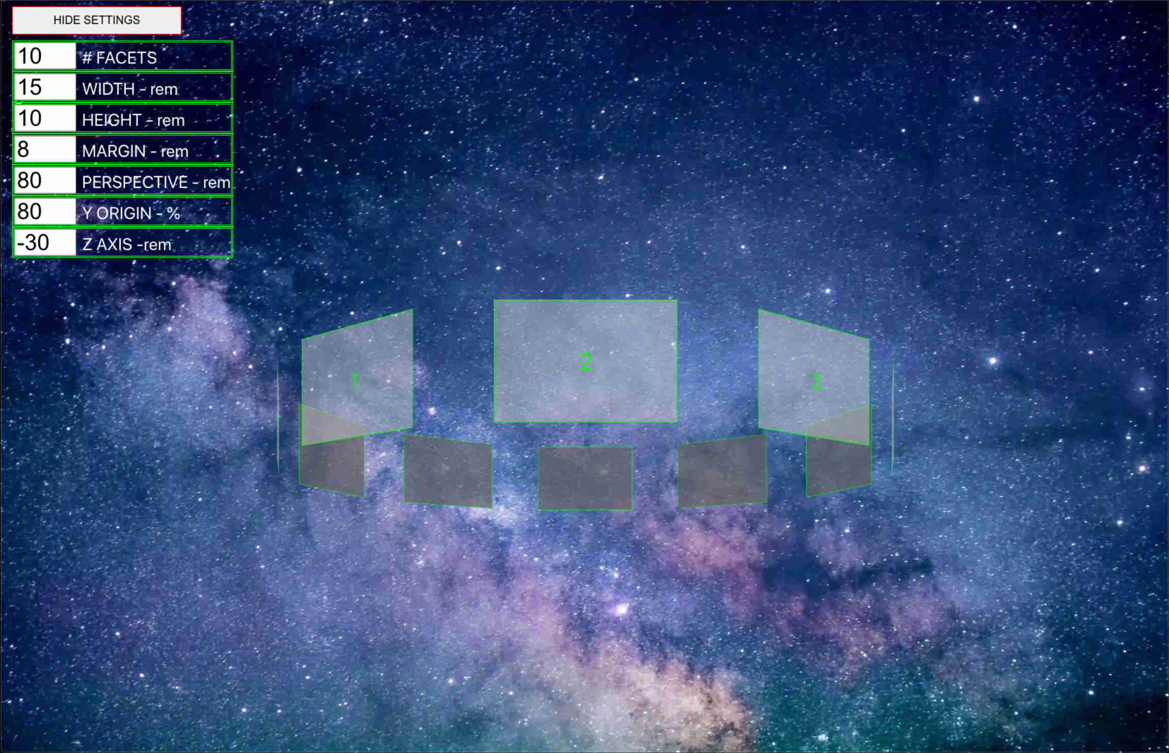 - css procedure for each facet - rotate it , then push it out along the z axis