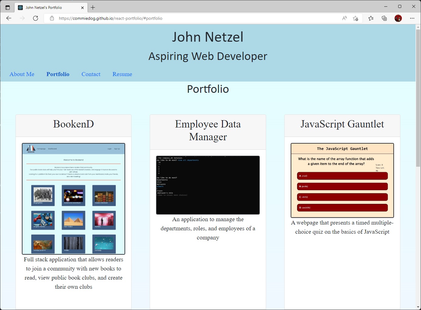 This project is my fourth attempt at a professional-looking portfolio page. This version features a multi-page design powered by the React framework. Among the biggest changes are to moving of the portrait to the About Me section and the creation of a Contact section with a form for contacting me via email.