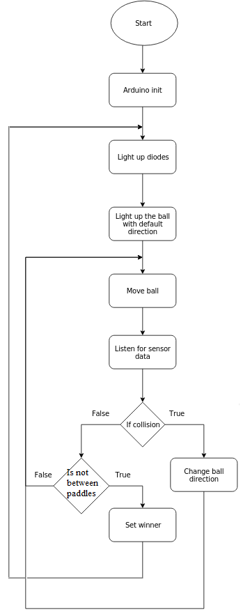 Всеки от играчите ще може с ръка да управлява “пръчката” си. Управлението ще става със сензори, които отчитат позицията на ръката спрямо полето. Самите “пръчки” ще се изобразяват със светодиоди. Със светодиоди също така ще се показва и топчето. През Ардуино ще управляваме логиката за отблъскването на топчето от “пръчките”, преместването им, преместването на топчето, логиката за точките и победата.