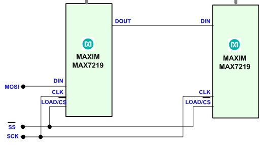 - Схема на каскадно свързване на MAX7219 към Arduino.