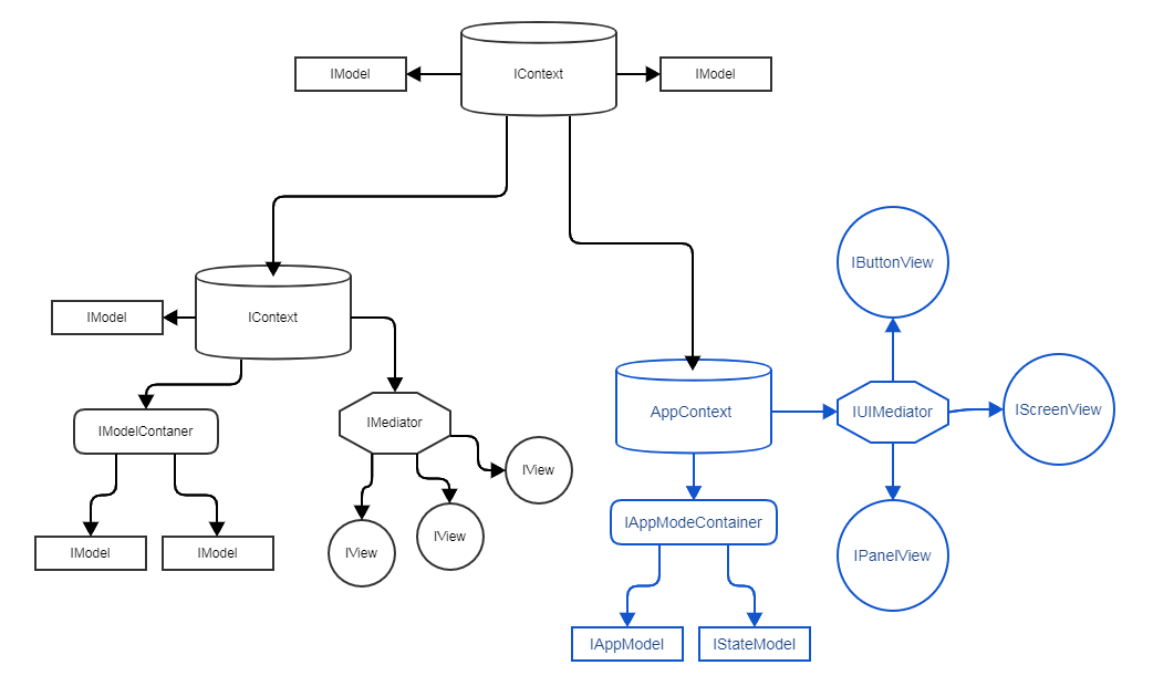 Right IContext is mapped to AppContext implementation. You can see its hierarchy on the screen: IModelContainer with 3 views.