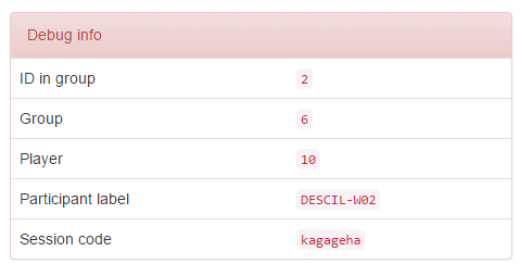 Any application can be run so that that debug information is displayed on the bottom of all screens. The debug information consists of the ID in group, the group, the player, the participant label, and the session code. The session code and participant label are two randomly generated alphanumeric codes uniquely identifying the session and participant. The ID in group identifes the role of the player (e.g., in a principal-agent game, principals might have the ID in group 1, while agents have 2).
