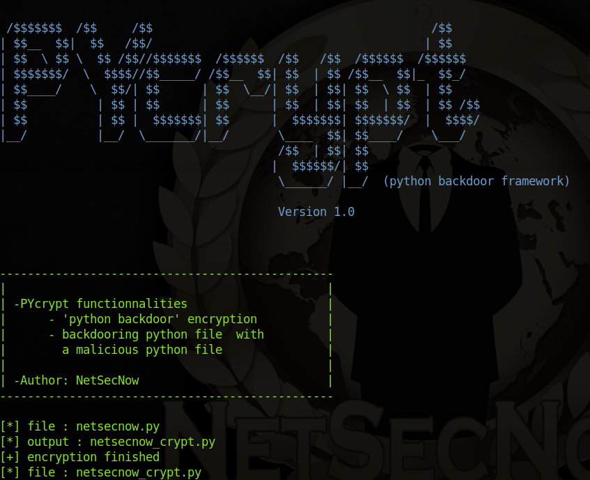 - sudo ./PYcrypt.py --file=backdoor.py --output=output_backdoor.py # encrypt backdoor.py and output file is output_backdoor.py