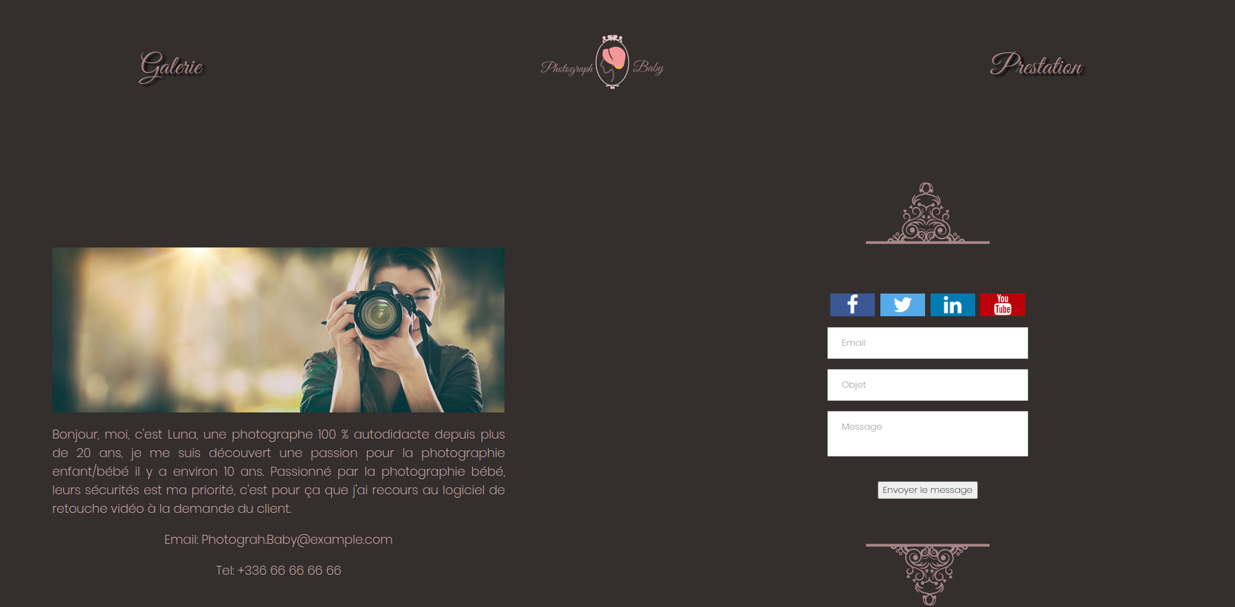 Photograph baby HTML CSS SASS SCSS Preview Homepage Gallery Contacts prestation WIREFRAME WIREFRAME FOR DESKTOP WIREFRAME FOR TABLET WIREFRAME FOR PHONE ➡️ Contact me for more informations ⬅️