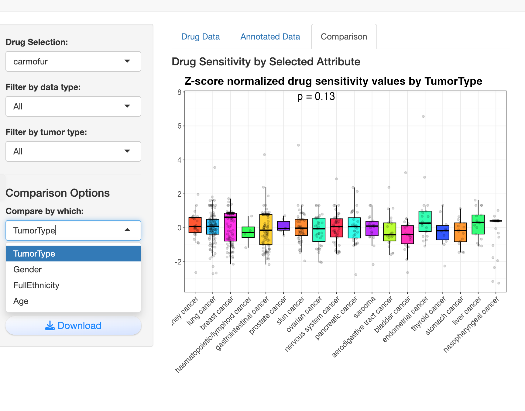 Comparison Analysis: Users can compare drug sensitivity across various biological attributes like tumor type, gender, ethnicity, or age, with visualizations automatically adapting to categorical or continuous variables.