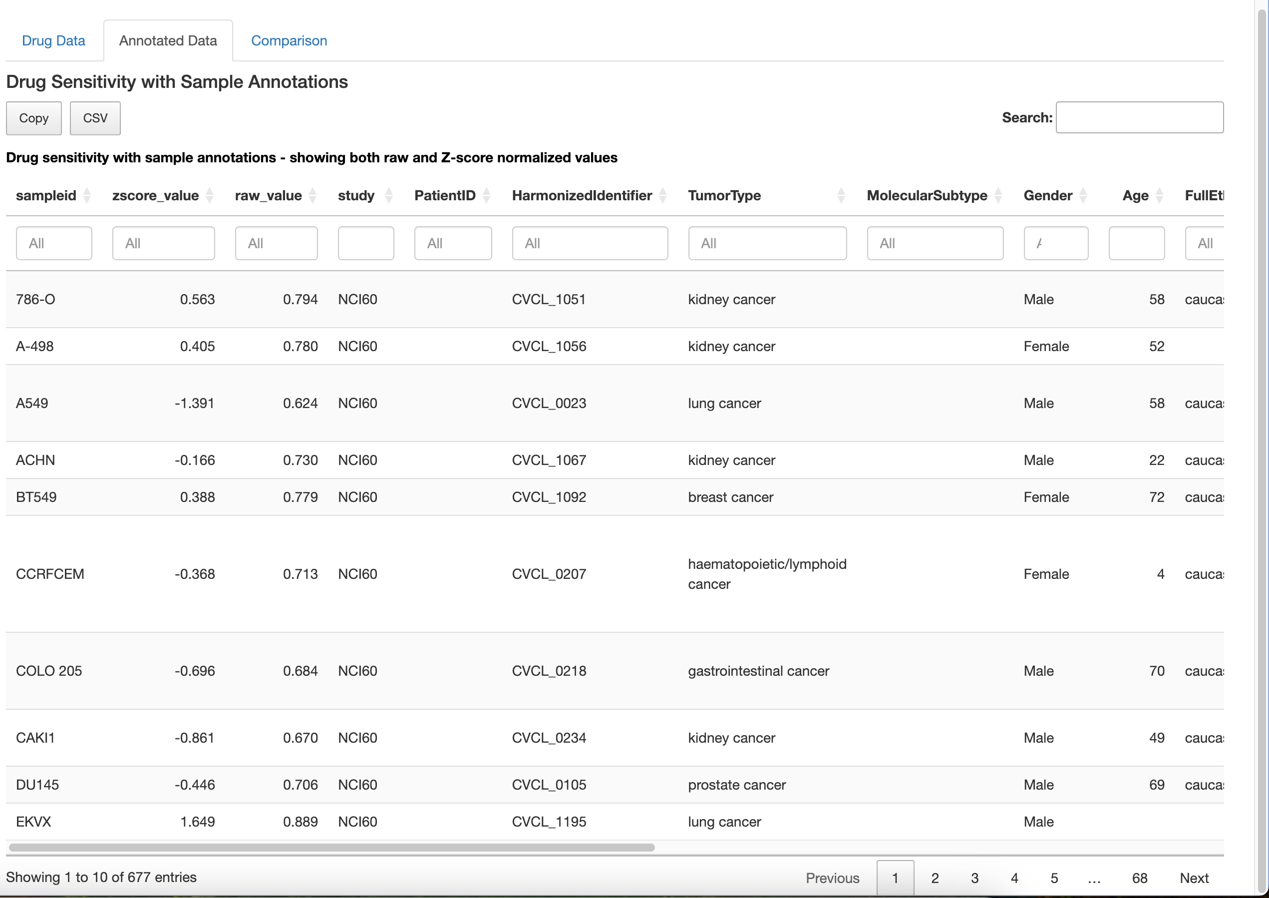 Interactive Tables: The module presents both raw and z-score normalized drug sensitivity data in interactive tables with built-in search, filter, and copy functions.