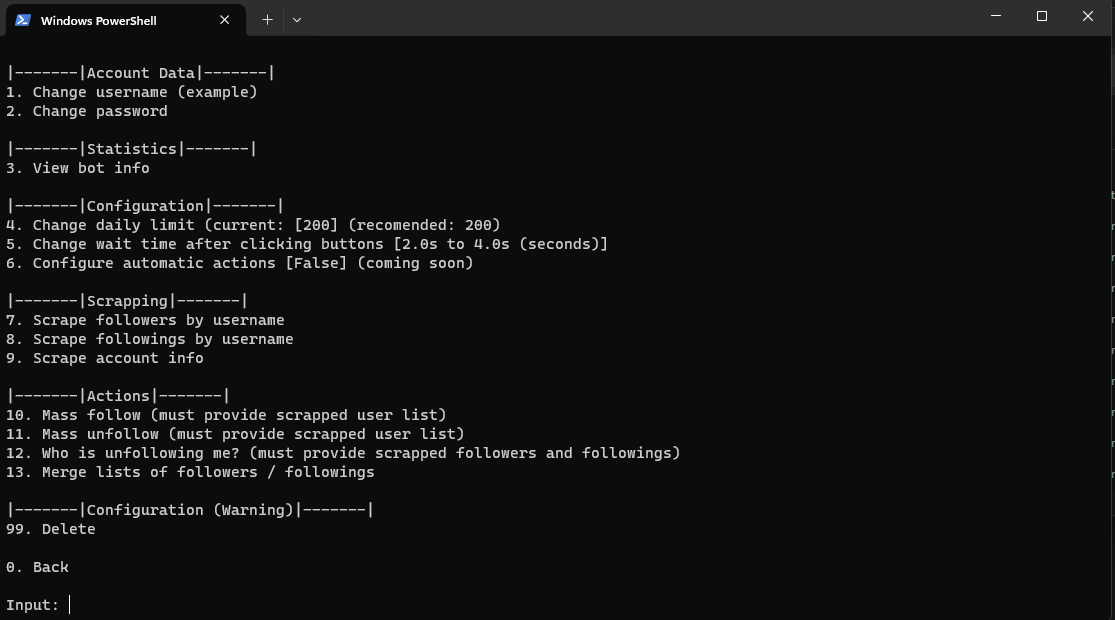 - Waiting a reasonable time between following/posting/etc (automatic and configurable)
