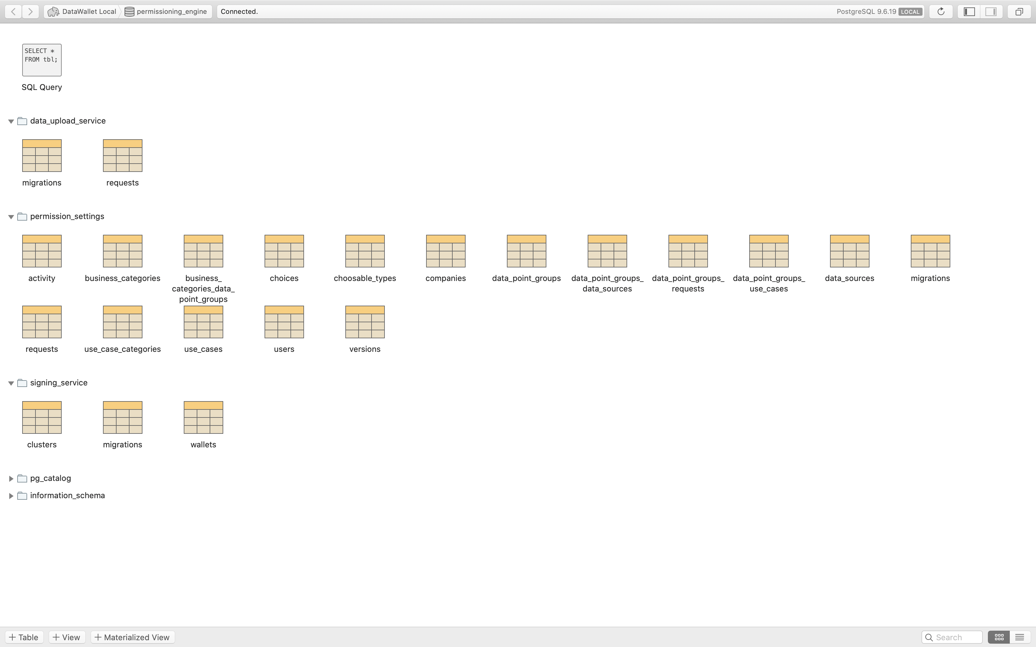 @datawallet/signing-service: 2020-09-16T12:34:08.752Z signing-service:service-base Running on port 5005And these are the tables which get created in DB instance: