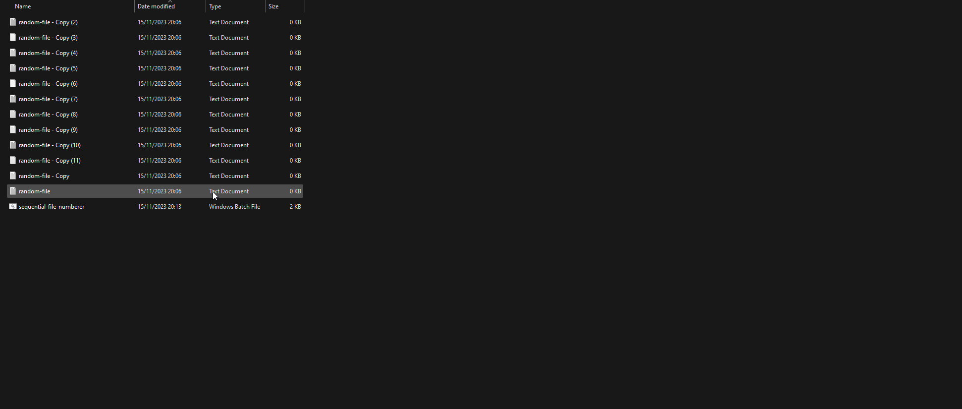 Sequential File Numberer This .BAT script renames files in sequential order. Features Rename in current directory. Rename in custom directory. Optionial prefix. File type filtering. Custom starting number. Changes preview. Checks for write access and path existence. Demo