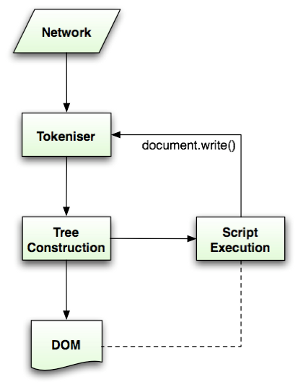 在遇到 <script> 标签时,浏览器默认会从文档解析转成 js 脚本解析,此时文档解析会被挂起,只有当脚本解析完成后才会继续文档。如果 <script> 是外链,则必须等到资源完全响应才能继续执行脚本。现代浏览器可以通过异步加载脚本来实现非阻塞执行脚本。
