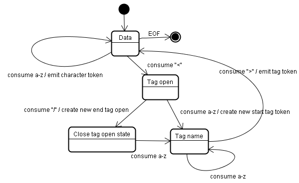 通过词法分析将 HTML 中有特殊含义的字段标记出来,比如起始标签、结束标签、属性名和属性值等等。标记化算法的基本思路是基于一个有限状态机,根据 HTML 输入不断更新状态机状态,然后根据状态提取标记。