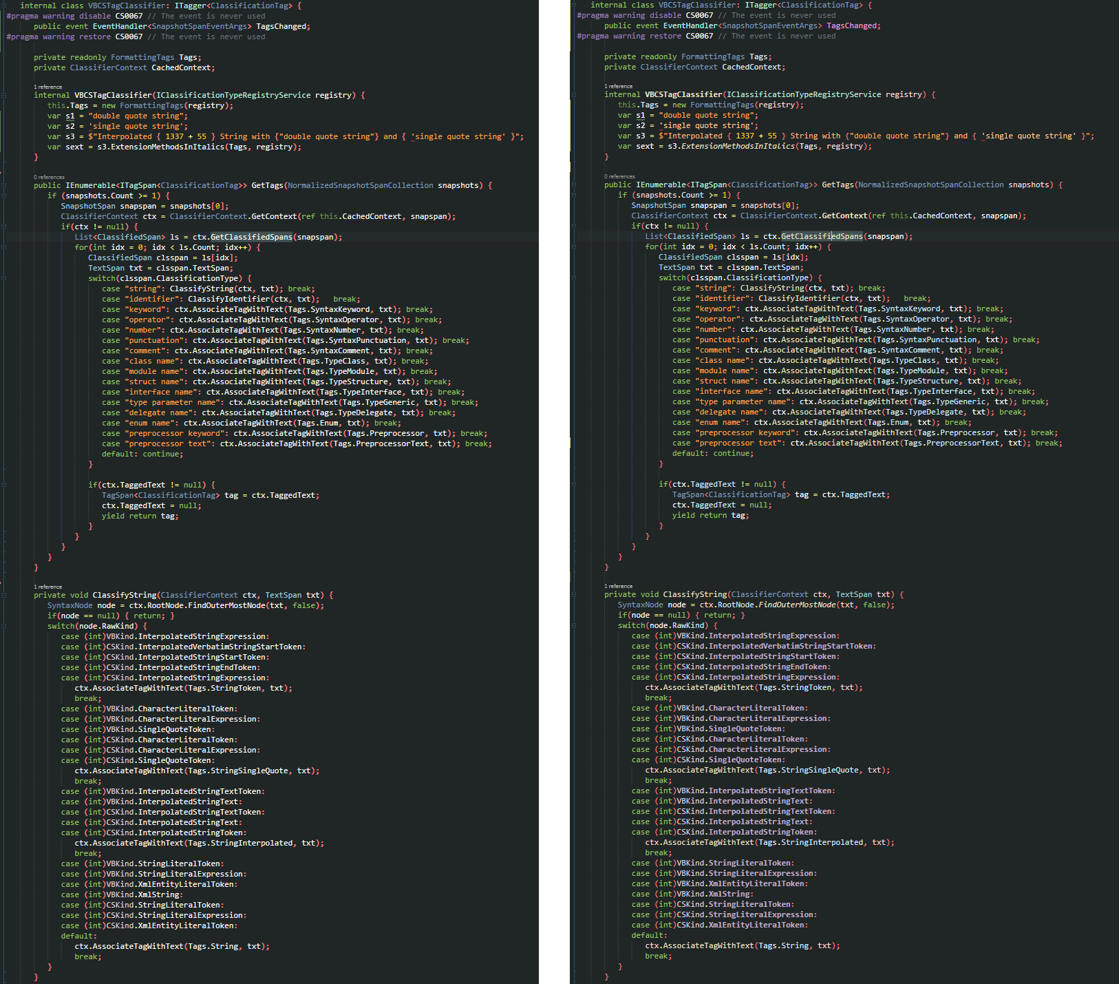 ZMBA.SyntaxColorizer Better Visual Studio Syntax Coloring and formatting. Allows italics. Before and After in C# Before and After in VBNet TODOs: -Create a menu so users have the ability to customize italics, fonts, transparency, etc. used depending on syntax classification.