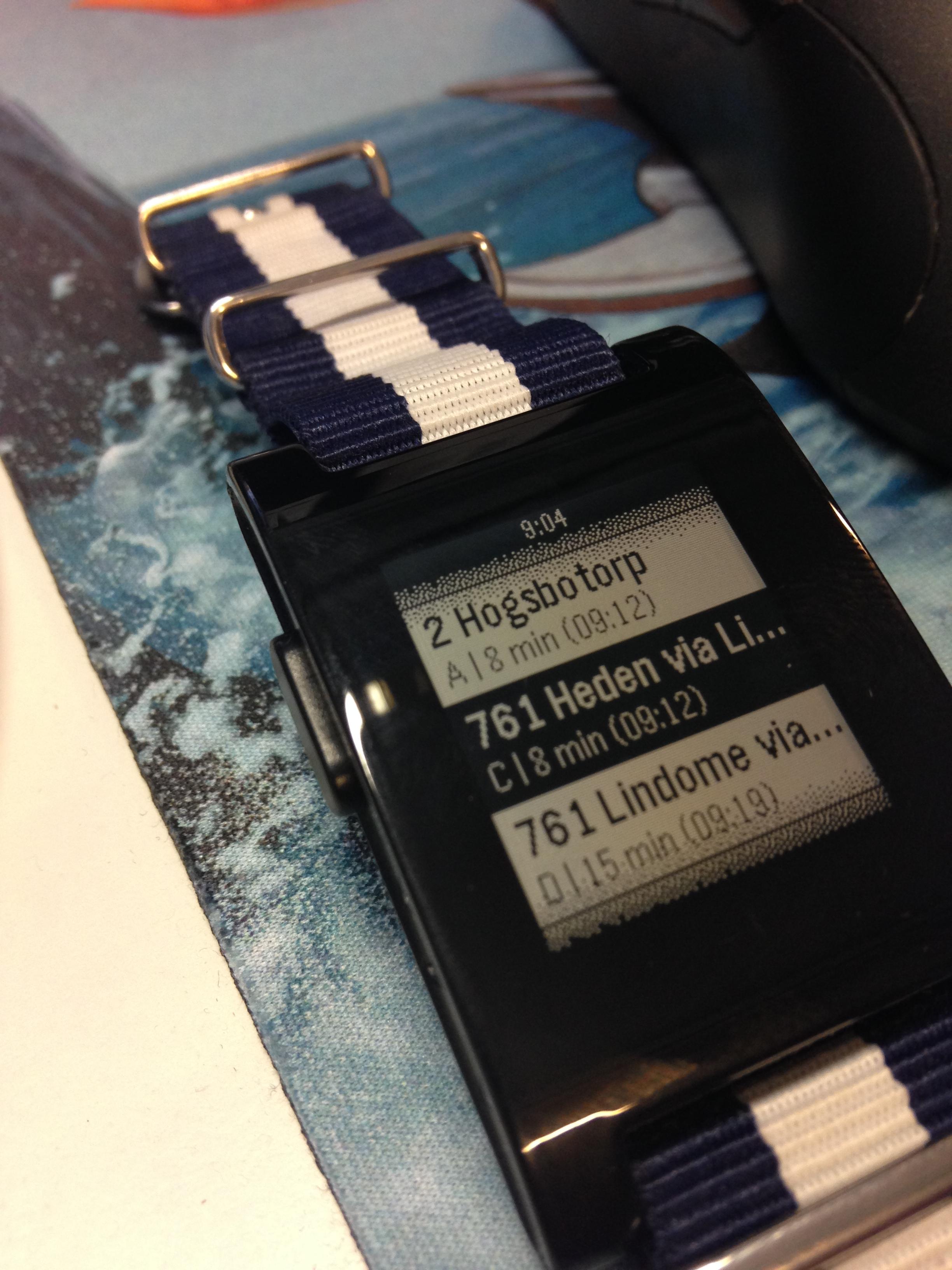 This is a pebble.js based application. It's built on top of the västtrafik API. Watchtrafik uses GPS geolocation data and send that to the API. The app then shows relevant stops close to the user (max 3000m area). The user now chooses the appropriate stop and all departures are shown along with their departure time, minutes to departure and letter of the substop.