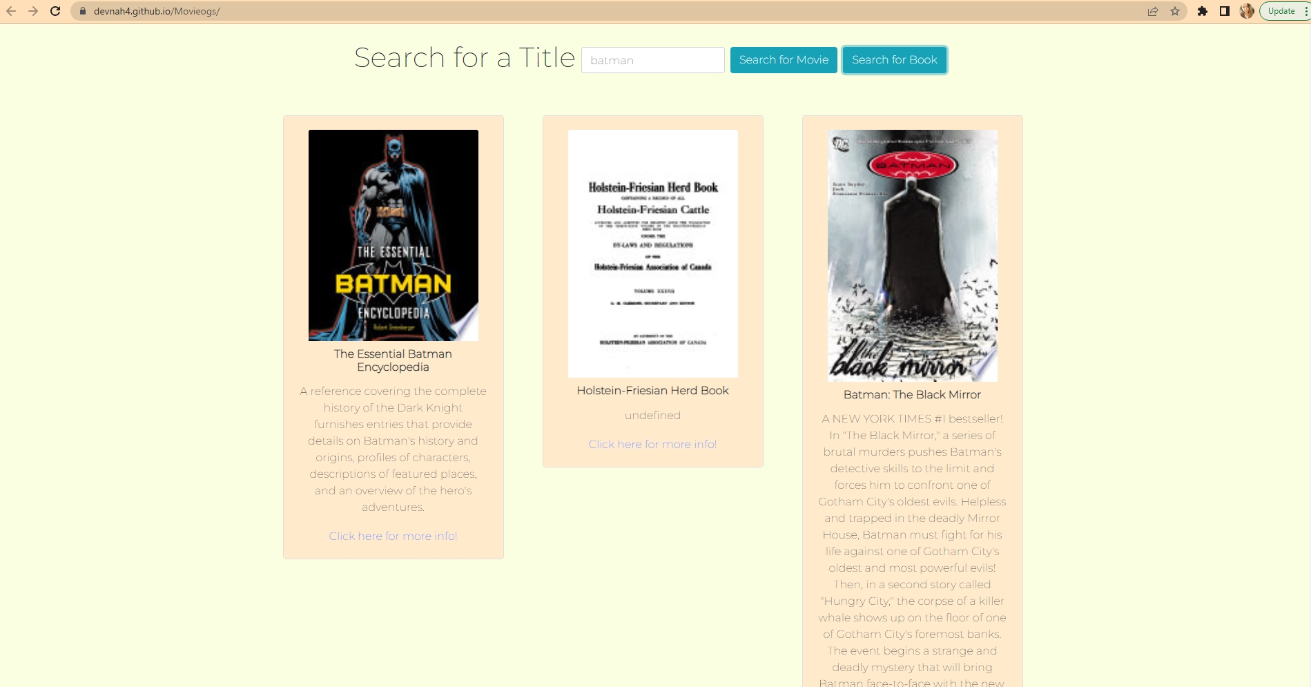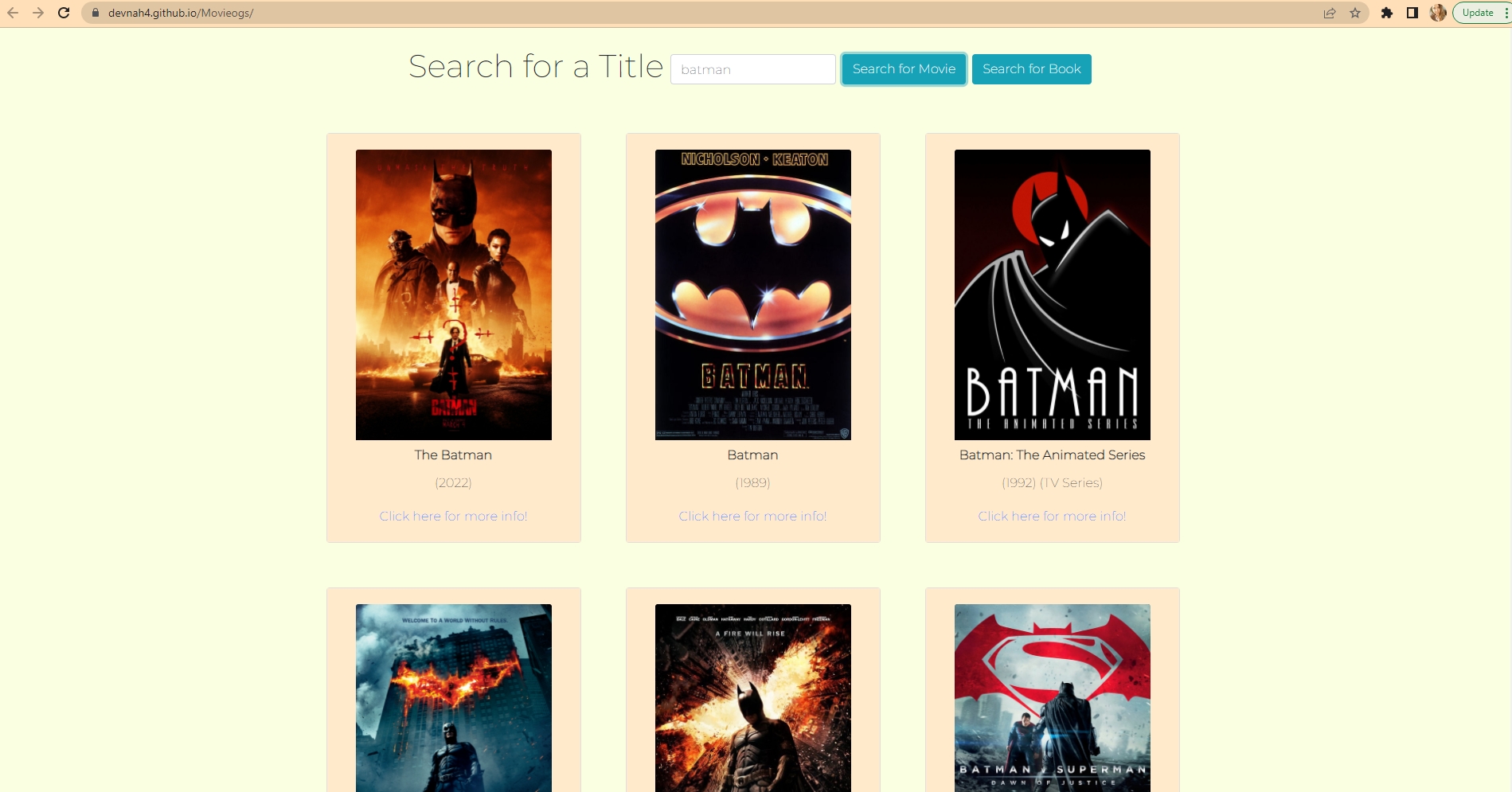 A function to look for both book searches and Imbd movie information. Is there a superhero movie you're interested in discovering some inner details? A book you're wanting to get the details on? Feel free to test out Movieogs.