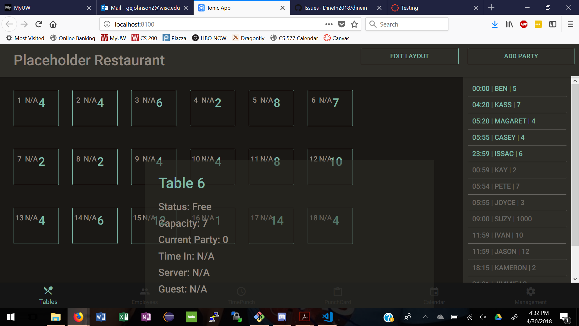 Description: From the "Tables" page, when clicking on any table and then viewing that table's information, the box that comes up gets stuck and there is no way to click out of it or click any other buttons on the screen. The screenshot shows what the "stuck" view looks like.