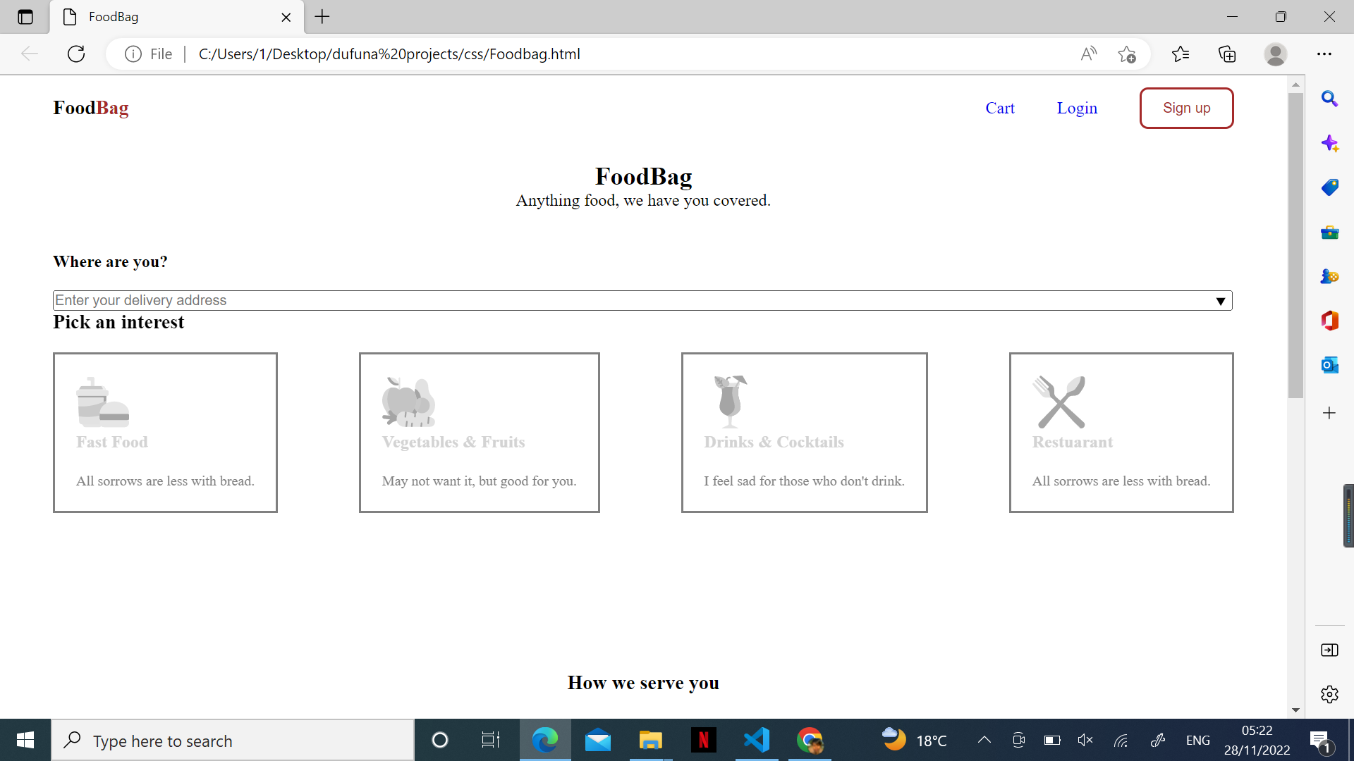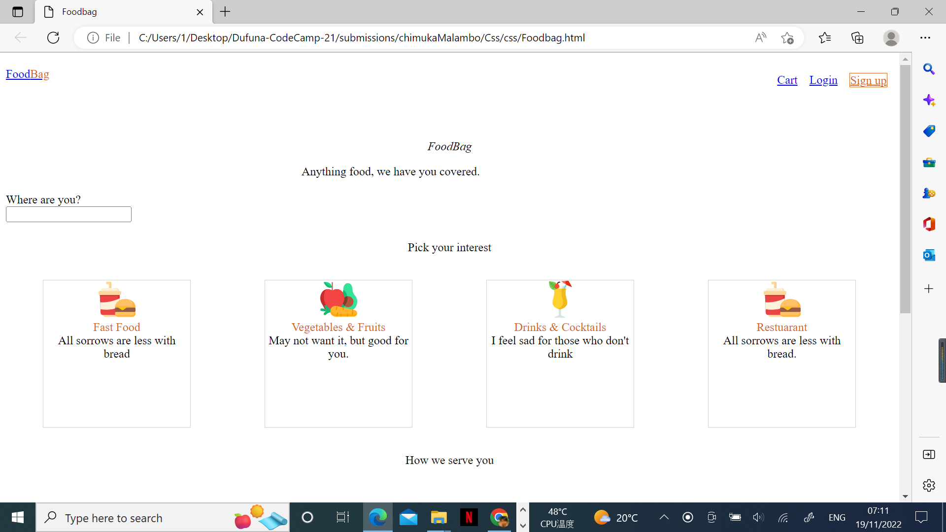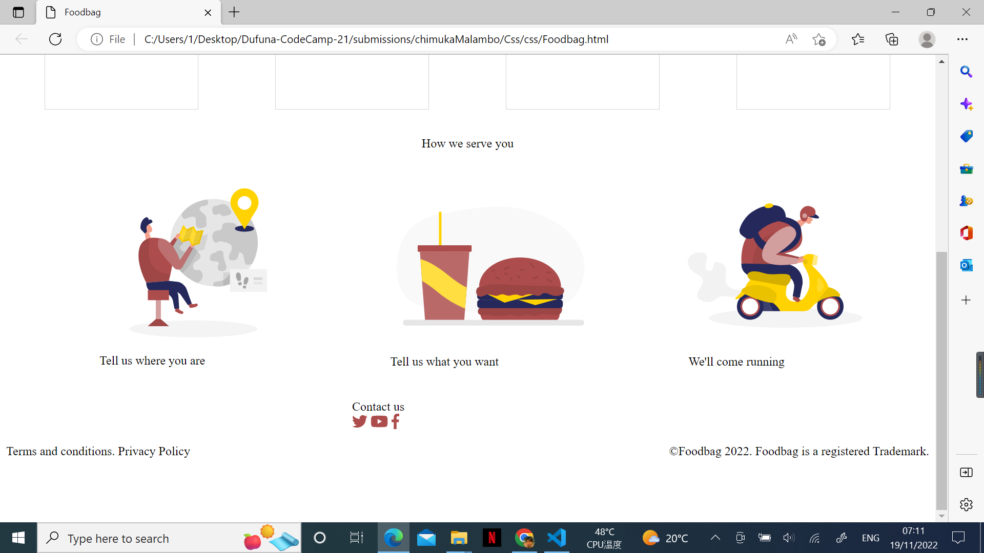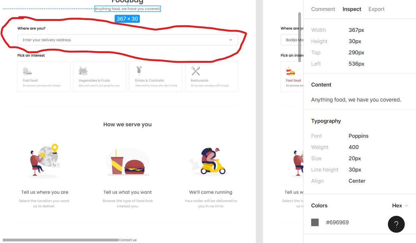 Well done @chimmalambo! You must ensure that your webpage looks precisely like the shared mockup on the Fifgma page: https://www.figma.com/file/qDRZt0susSQ5k4wEgB09hU/FoodBag-beginner?node-id=13%3A0. It's the highlighted page you are to work on. You still have some corrections to make. |
