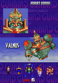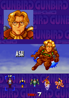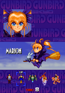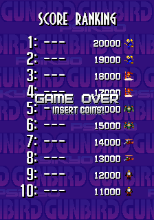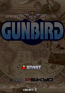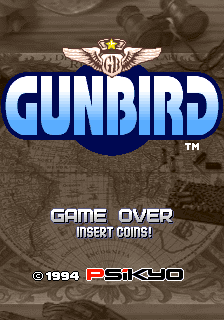 The first screen seen when starting Gunbird displays, blinking, the messages "GAME OVER" and "INSERT COIN". Behind these, the company's (Psikyo) logo, the credits of the game, a cutscene featuring the game's characters and the name of the game, and a demo using Marion and Ash in cooperative mode, is played. Finally, it shows the score screen. This screen is replaced by the Start Menu when a coin is inserted in the machine, returning to the Looping Cutscene if the player does not press start for some seconds, and until "START" button is pressed. During this second display of this screen, a "START" text will be shown instead of "INSERT COIN", and it will also show the current amount of coins in the machine, and will return to the Start Menu if any button is pressed.