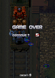 When the player hasn't got any extra lives left, it will be a Game Over and this screen will show up. It will endarken the scenario and characters and show a "GAME OVER" message, and below it "CONTINUE?" and a counter. Also on the bottom of the screen the current credit will be shown. If the timer expires and the player hasn't hit START, the game will return to the looping cutscene.