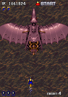 The game HUD displays the data of Player 1 in the left of the screen and the one of Player 2 in the right. Each player's data consists of the score, shown on the top of the screen. Under the score is the current amount of lives the player has left. Upon dying, the player will lose a life. On the bottom of the screen there is the amount of bombs each player currently has. If only one person is playing, on the top-right corner it will appear "INSERT COIN" if there isn't credit available, or "START" if there is, and on the bottom-right corner the Credit that is available is displayed.