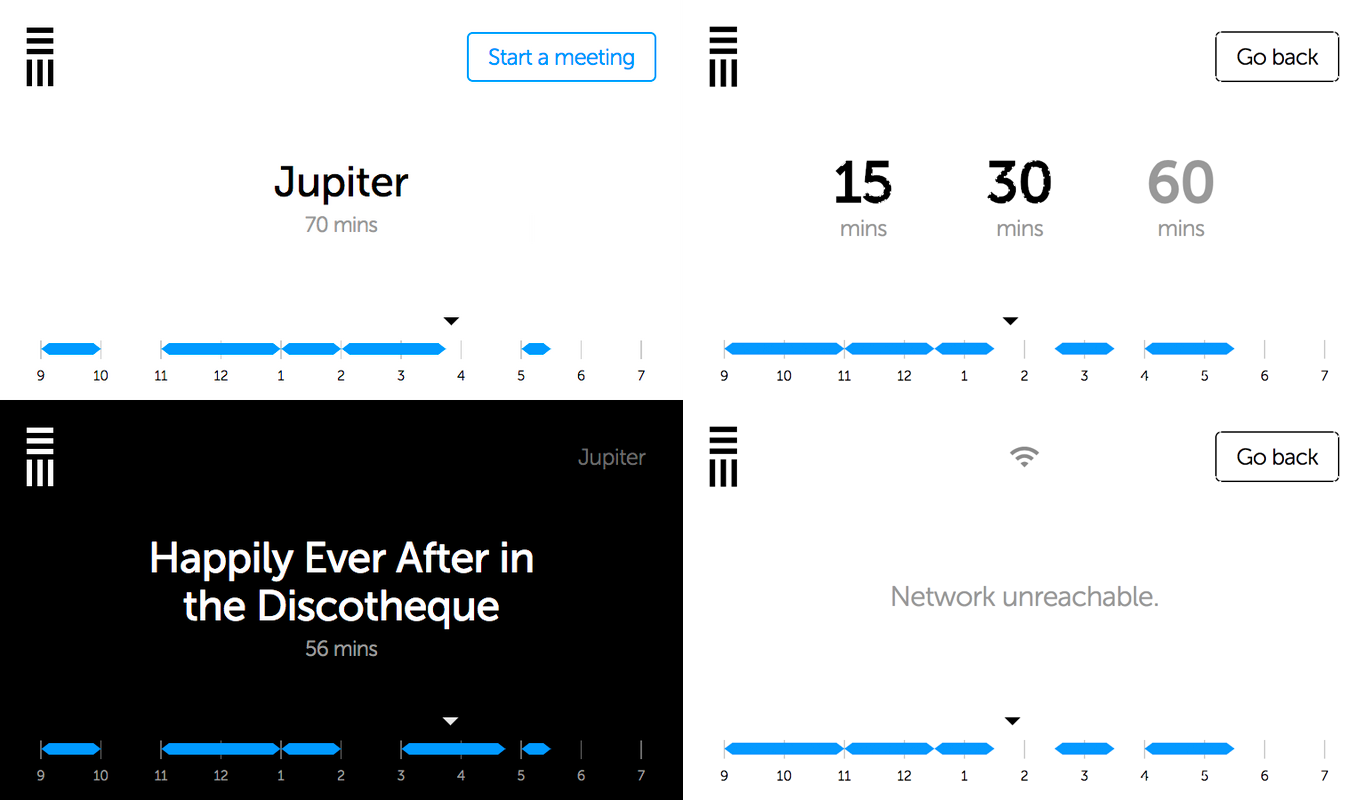We targeted an unobtrusive, simple look in order to blend in with the office environment. There two main modes, expressed via background color. This allows us to see, even from a distance, whether the space is available or not. White background means the room is available, while black background signifies the room is occupied. A title of the current event (or the room name) displayed in the center along a remainder for the current event, or until the next one.