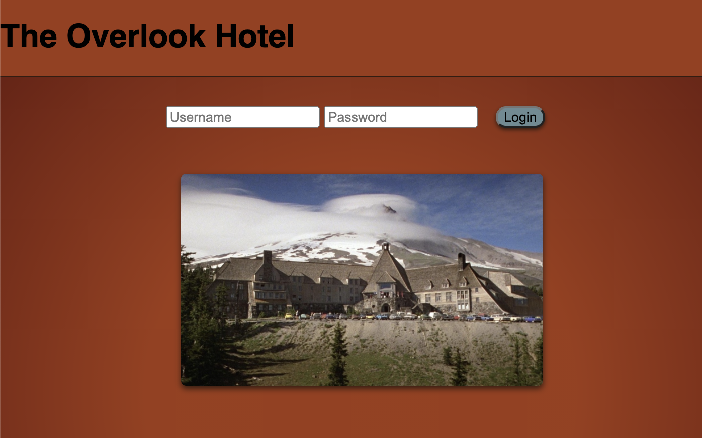 Login screen for The Overlook Hotel, which requires the user to enter a username and password to access the app: