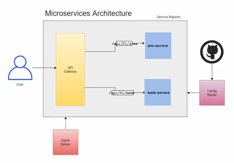 - atm-service: Access forbidden to database and make request through bank-service