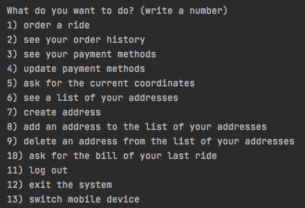 There is an interface in my program. Firstly, the user should login to the system. The program checks if there is such a user in the list of passengers or in the list of drivers. If there is no such user it asks the user to try again, othrerwise it prints out the general interface of a driver or passenger. This interface is implimented in the interface file. Depending on user's input it executes different functions from the Passenger class or Driver class. These user classes also provide additional interface for futher interaction with a user (for example to choose "from" and "to" of a ride or to choose payment method). User can print the number of the action he wants to be executed.