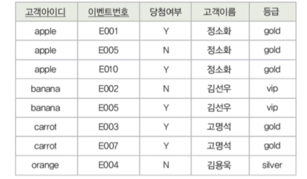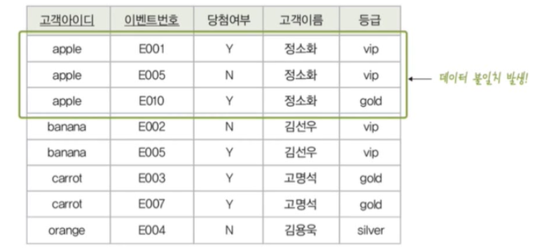 - 예) 아이디가 'apple'인 고객의 등급이 'gold'에서 'vip'로 변경되었는데, 일부 튜플에 대해서만등급이 수정된다면 'apple'고객이 서로 다른 등급을 가지는 모순이 발생