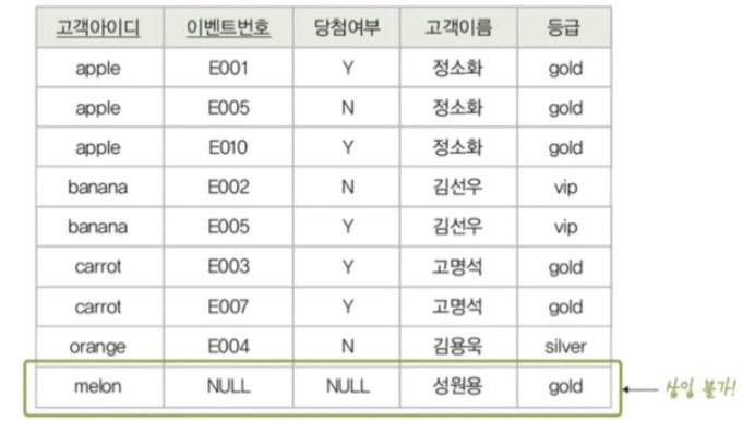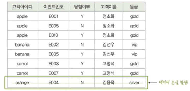 - 예) 아이디가 'orange'인 고객이 이벤트 참여를 취소해 관련 튜플을 삭제하게 되면 이벤트 참여와 관련이 없는 고객아이디, 고객이름, 등급 데이터까지 손실됨