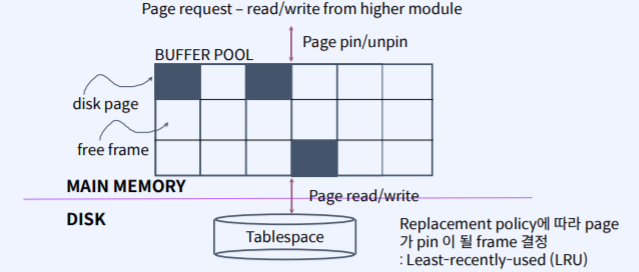 - 없는 경우, replacement policy(LRU)에 의해 오래된 frame unpin후에 frame 결정
