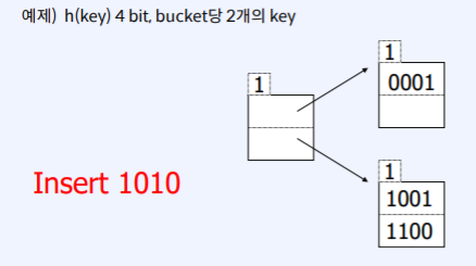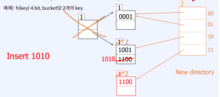 - bucket이 overflow가 발생하면 hash function의 prefix를 늘려가며 bucket의 개수를 늘린다