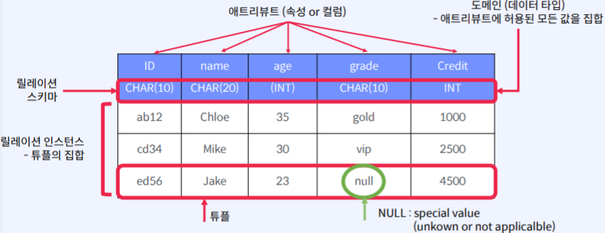 - 개체에 대한 데이터를 저장하는 논리적 구조 - 릴레이션(2차원의 테이블 구조)