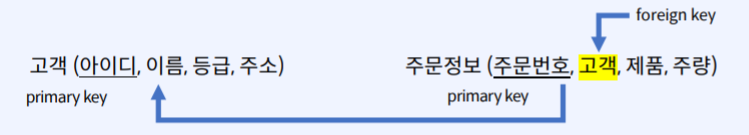 EX) [수강] 릴레이션이 [학생] 릴레이션을 참조하고 있으므로, [학생] 릴레이션의 학번은 기본키이고, [수강] 릴레이션의 학번은 외래키이다.