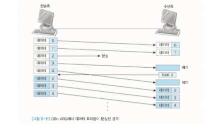 - GBn ARQ의 특징은 데이터를 재전송하는 부분이다. NAK(n)을 받아 n 데이터 이후의 모든 데이터를 재전송한다