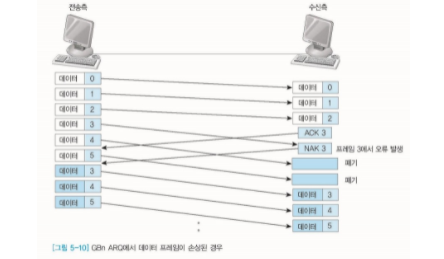 - 전송된 프레임이 손상되거나 분실된 경우 그리고 ACK 패킷의 손실로 인한 Time-out이 발생한 경우, 확인된 마지막 프레임 이후로 모든 프레임을 재전송한다