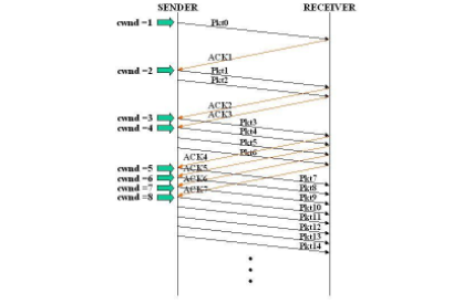 - Slow Start는 AIMD와 마찬가지로 패킷을 하나씩 보내는 것부터 시작한다. 이 방식은 패킷이 문제 없이 도착하면 각각의 ACK 패킷마다 Window Size를 1씩 늘린다. 즉, 한 주기가 지나면 Window Size는 2배가 된다